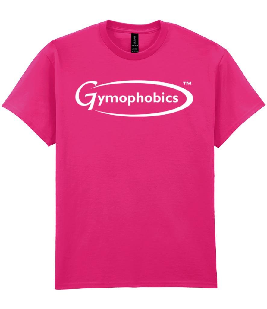 The Gildan Ultra Cotton T-Shirt offers a classic fit, complemented by a ribbed collar and reinforced taped neck and shoulders for enhanced durability. It features twin-needle stitching on both sleeves and hem, along with a tubular body construction. The tear-out label ensures added comfort. The front displays the Gymophobics logo, available in black, white, or optional glitter prints for a small additional fee.